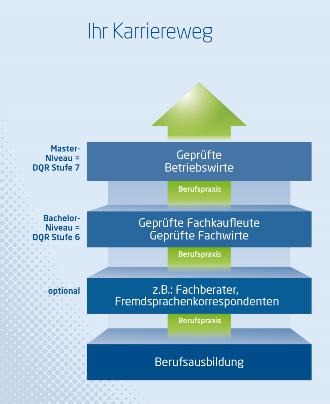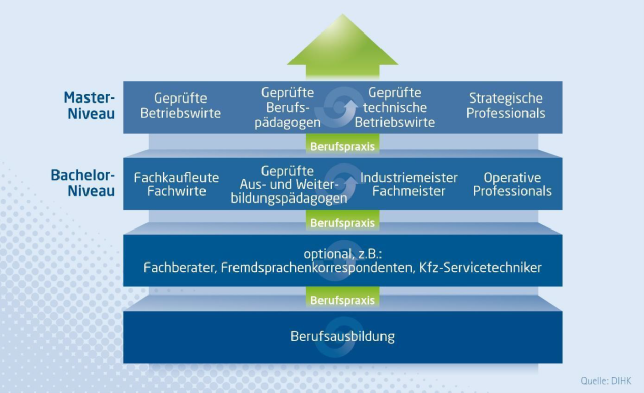 Wie auch die hochschulischen Bachelor-Abschlüsse wurden Fachwirte- und Meisterabschlüsse dem Niveau 6 zugeordnet. Dabei sind die Betriebswirte gleichwertig mit dem Masterstudium. Somit entspricht eine IHK-Weiterbildung einem Bachelor-Studium. Weitere Informationen zum Abschluss-Niveau finden Sie auch unter www.dqr.de